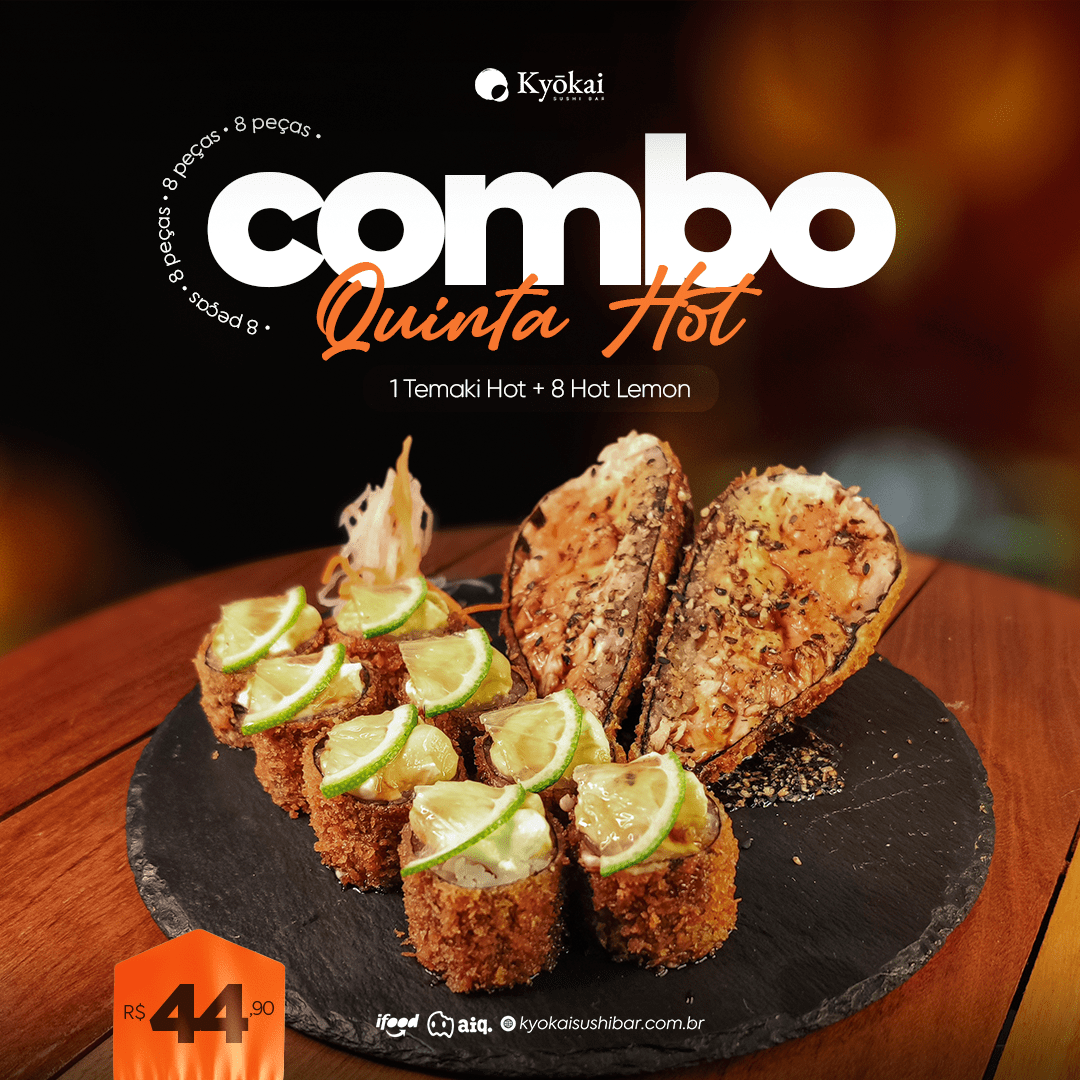 5 Sashimi de salmao, 4 Uramaki Filadelfia, 2 Niguiri Salmao, 2 Niguiri Skin Lemon, 4 Hot Filadelfia, 4 Hot Crispy de Couve e 4 Gunkan Filadelfia